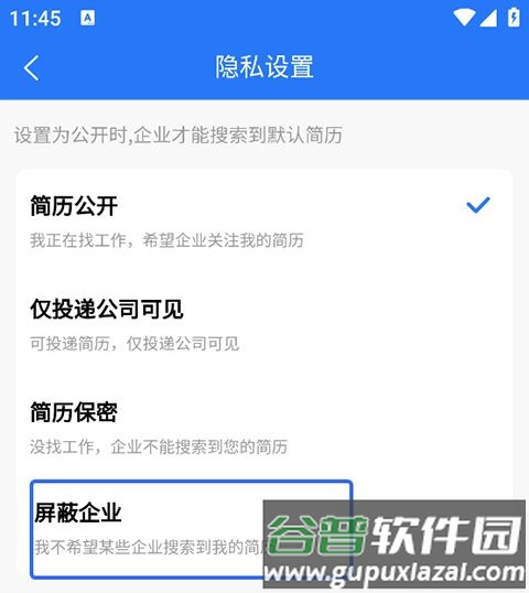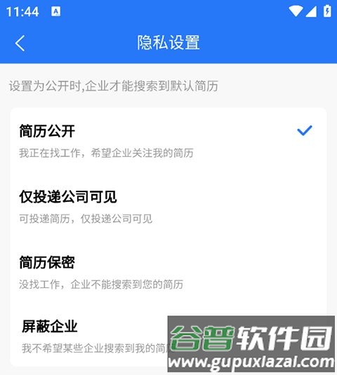 2、在隐私设置界面可以将建立设置为公开、仅投递公司可看等。