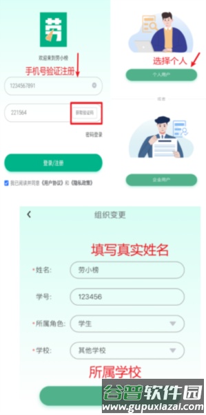 学生注册步骤:使用手机号获取验证码完成注册,选择个人用户身份。