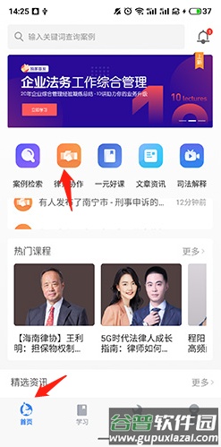 1、打开app,进入底部“首页”板块,找到并点击“律师协作”功能入口。