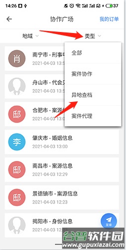 2、点击“类型”筛选按钮,在下拉选项中选择“异地查档”类别。