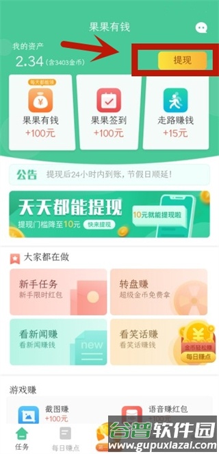 3、按照指引完成指定新手任务后,即可点击提现功能按钮。