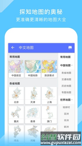 中国地图:提供高清大图与政区地图;世界地图:包含中文与英文版本;旅游地图:附带旅行攻略信息;历史地图:呈现各朝代版图与朝代列表;地铁线路图:高清大图展示;百度在线地图;知识答题:趣味问答环节;阅读服务:各类知识内容自由阅读;实用工具:集成指南针等功能;主题皮肤:可切换精美动效主题。