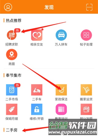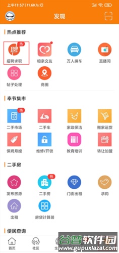 5、点击底部的“发现”页,能看到招聘求职、家政保洁、二手房等更详细的服务分类。