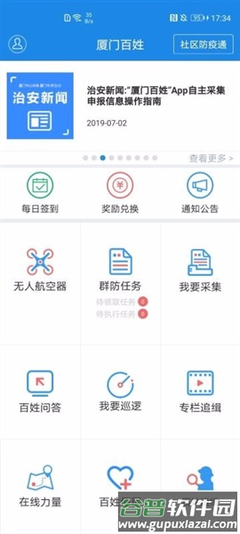 4. 主页设有群防任务、奖励兑换、线索举报等六大板块;