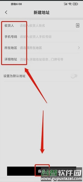 3、在新建地址页面,完整填写收货人姓名、手机号码、所在地区及详细地址信息,最后点击【保存】完成添加。