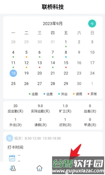 3、点击底部“日历”图标可查看每日出勤状态与打卡记录,支持查询请假、外出及考勤异常情况。