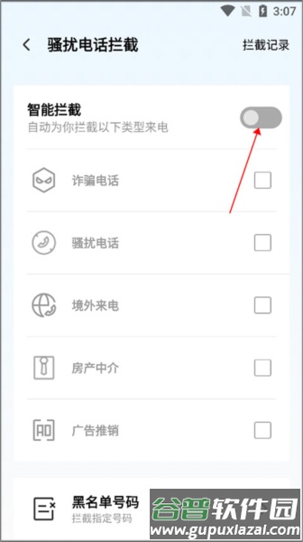 4、启用智能拦截功能即可自动拦截骚扰电话。
