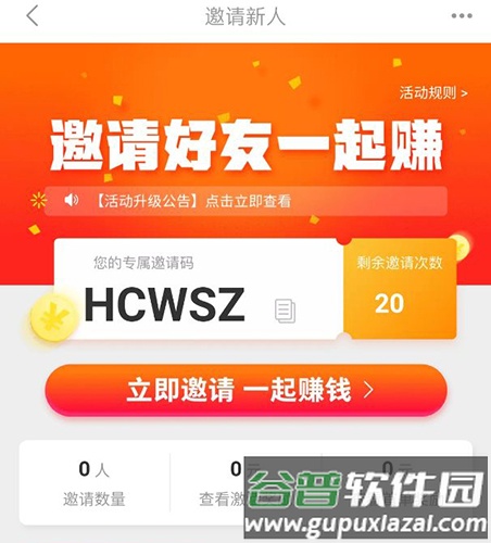 在此页面可以找到您的专属邀请码,例如示例中的“HCWSZ”;通常邀请人数存在上限,例如二十人。