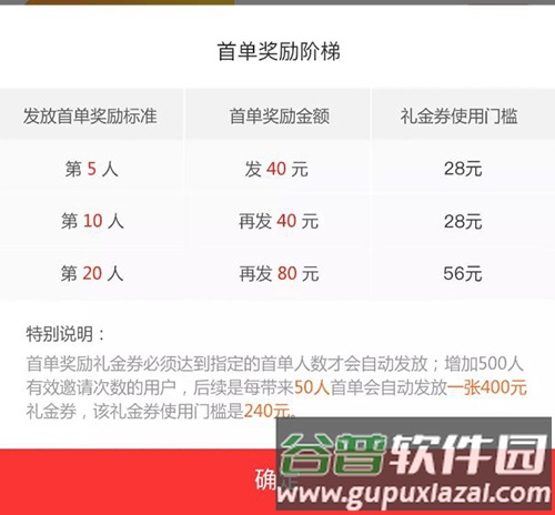 成功邀请一位新用户可累计获得五元礼金券奖励;若新用户完成下单,邀请人可再累计获得八元礼金券。