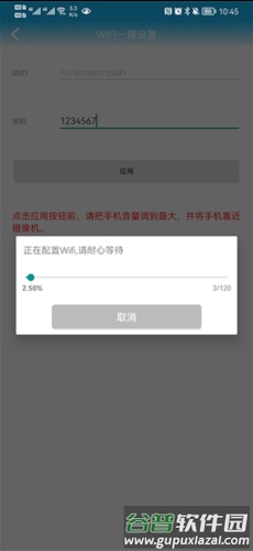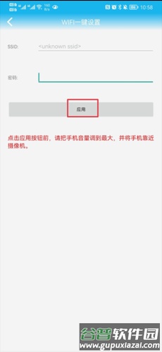 三、输入无线密码并点击应用,连接时请调高手机音量并靠近摄像头。