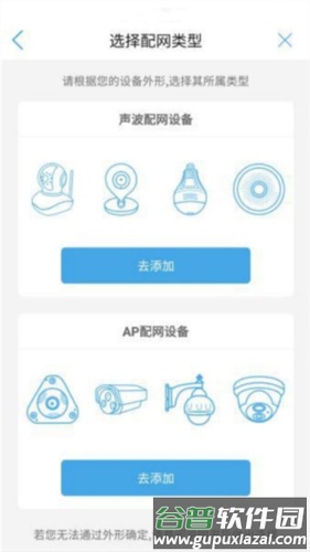 ②若设备未接入网线,点击未接入网线按钮,进入配网类型选择界面;声波配网适用于摇头机、卡片机、灯泡机等设备;AP配网适用于枪机、云台机、球型机等设备。