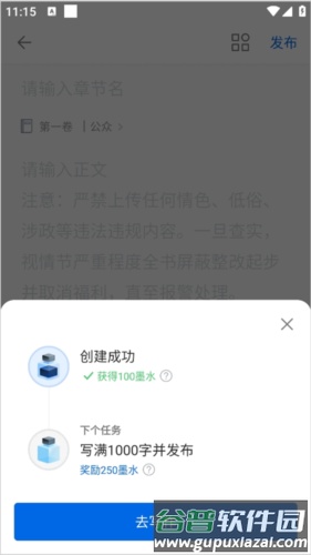 完成章节后,可一键将内容发布至阅文集团旗下平台;