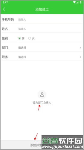 3、若选择手动添加,需填写员工手机号、个人信息及所属部门等内容;确认后点击下方“添加并发短信……”,员工将收到邀请短信,即表示添加完成。