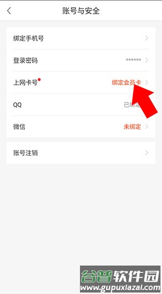 5、进入后找到“上网卡号”绑定入口,点击并按提示输入卡号信息完成绑定。