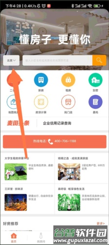 1、打开麦田在线应用,在主页左上角可看到当前城市名称,点击该位置;