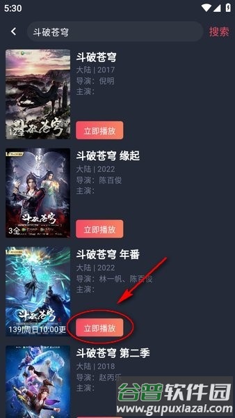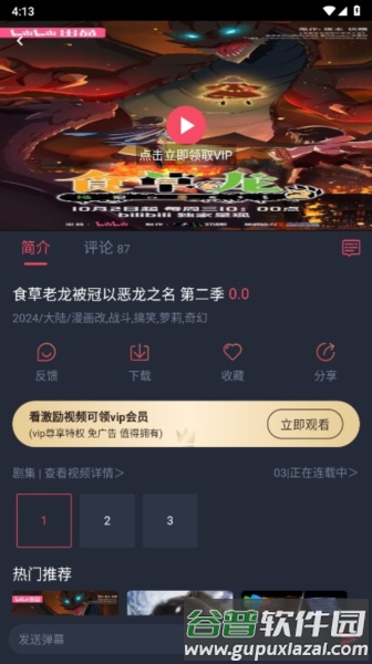 4、找到目标动漫后,点击右下角的“立即播放”按钮;进入播放界面后,点击屏幕即可开始无广告播放。
