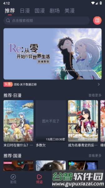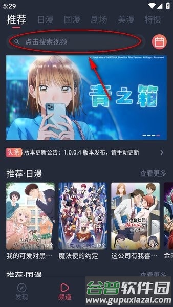 1、打开动漫共和国应用,在“频道”页面点击顶部的搜索框。
