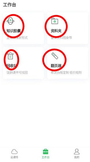 切换到工作台页面,可以找到知识胶囊、资料夹、翻页器等功能入口;
