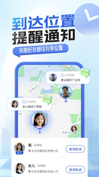 1. 实时定位:查看亲友当前所在位置和活动轨迹,手机端同步更新对方的实时动态;