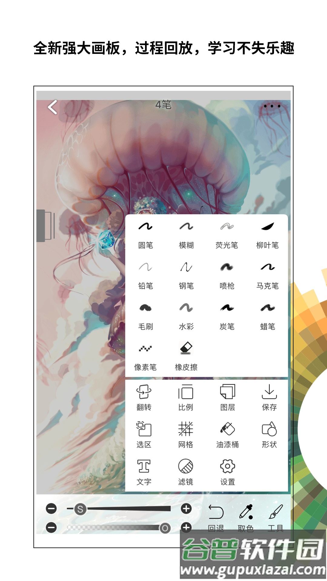 除了画笔,它还加入了文字工具、滤镜和油漆桶等辅助功能,帮助用户打造更精致的绘画。