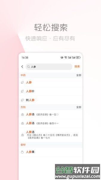 输入药材名、方剂名或经络穴位名称,系统会快速反馈结果并按分类展示,用户可根据分类轻松定位所需内容,节省查找时间。