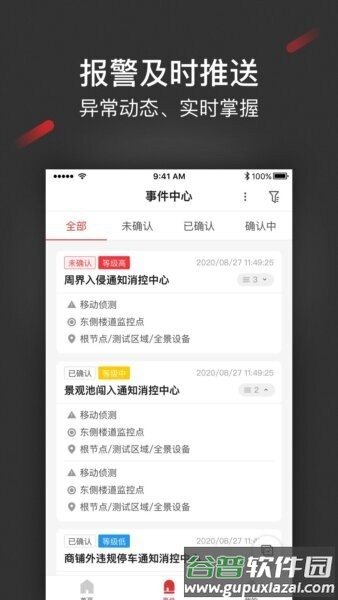 通过事件中心集中管理所有报警信息,分为全部、未确认、已确认和确认中四类;报警等级分为高、中、低,用户能及时获知周界入侵、违规停车等异常事件,确保第一时间应对。