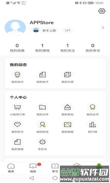 包括我的收藏、课程、考试、动态、证书、积分、粉丝、相册等部分,方便用户查看并管理个人学习成果与社交信息。