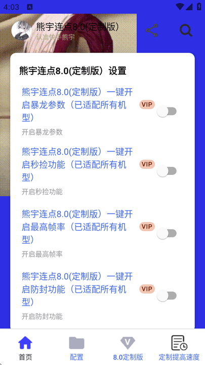 熊宇连点8.0定制版已经完成全部会员功能解锁,所有标注vip标识的功能都无需额外付费就能直接调用。软件内置多种模式的点击玩法,不需要额外找破解补丁或者付费开通权限,还搭载了专属帧率解锁模块,你可以根据自身设备的承载能力,一键解锁对应游戏的帧率上限,最高可以直接开启240hz高刷运行模式。