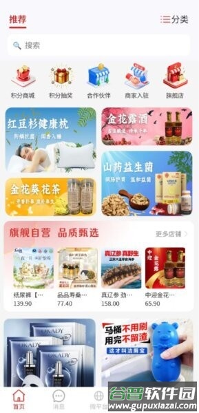 积分商城内包含多种优质商品,如真辽参、金花葵花茶、纸尿裤、面膜等;用户可直接使用积分兑换,也可选择积分加现金购买,商品分类明确,便于快速查找所需商品。