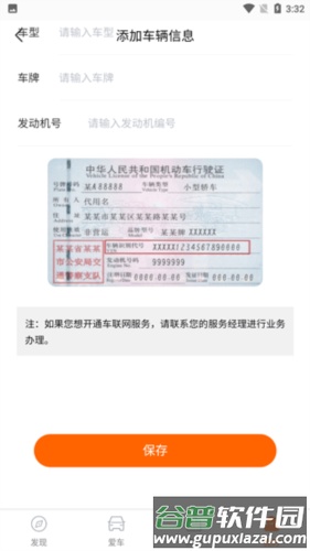 3、按提示输入车架号、车型、车牌及发动机号,保存后即可成功绑定。