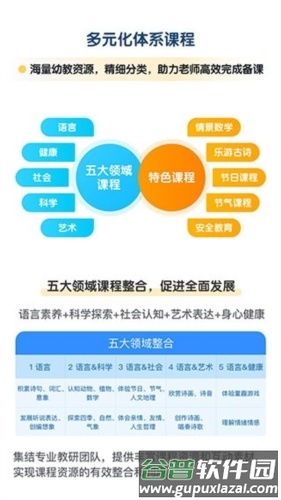覆盖健康、语言、社会、科学、艺术五大领域及多个常见主题,每一课件均配有演示文稿、详细教案、音频视频以及可打印的教具材料。