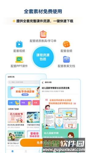 2、电子素材海量:拥有大量高清图片资源,如环境布置、手工制作、纸质教具、调查表、海报、奖状等,同时包含手指操、动画、古诗等音视频素材,帮助教师轻松准备教学材料。