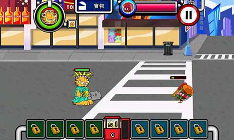 1、游戏开始时需要依次选择关卡、队友、技能和道具,确认后即可开启冒险。通过左右滑动屏幕可以控制加菲猫移动。