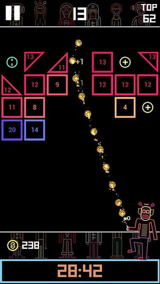 bbtan由知名开发商111%打造,是一款颠覆传统的打砖块游戏。玩家只需按住屏幕向下拖拽调整角度,松开即可发射小球。砖块上的数字表示需要击中的次数,当砖块触底游戏结束。游戏过程中可以收集各种道具,如增加小球数量、触发激光特效等。随着球数增加,看着数十个小球在屏幕上弹跳,会产生奇妙的爽快感。