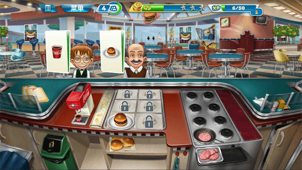 1、首关教学会教你基础流程:点击顾客查看订单→组装汉堡→及时上菜→收取餐费,注意烤焦的食材要丢进垃圾桶。