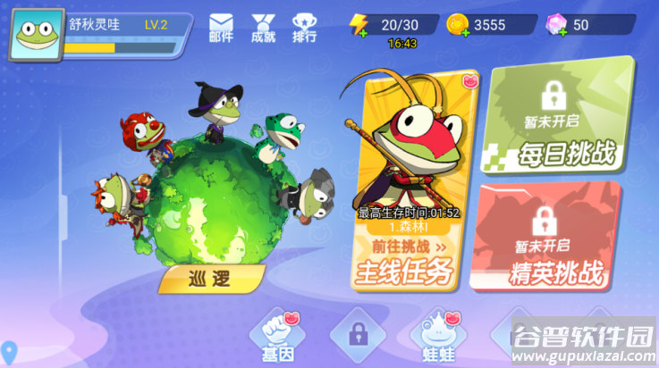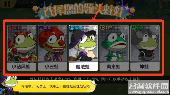 1、游戏开始时需要选择初始青蛙角色,不同青蛙拥有各自的属性特点;