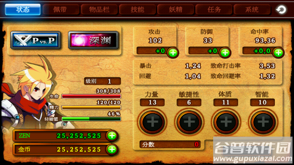 1、人物状态(STATUS)。属性面板分为三部分:第一排显示基础战斗数值,包括ATT(攻击力)、DEF(防御力)、HIT(命中率);第二排为暴击相关属性,CRI(暴击强度)、C.DMG(暴击伤害倍率)、EVA(普通闪避率)、C.EVA(暴击闪避率),需注意这些数值并非直接换算为百分比概率;第三排是四项基础属性,STR(力量)、DEX(敏捷)、CON(体质)、INT(智力),不同职业的属性加成权重差异显著,例如火枪手的智力会全面提升战力,而战士的智力仅影响特定属性。