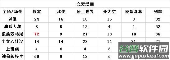 前三分别是:上班族+列车=48分;神秘转校生+教室=30分;傲娇双马尾+教室=16分、油腻大叔+列车=16分。