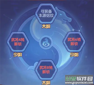 武将转生后开启本源铭纹系统,分为太阳、少阴、少阳、太阴四种类型。通过强化、进阶、升星和铭刻等方式提升属性。