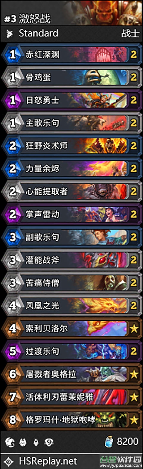 改良版激怒战融合火焰体系,心能提取者配合炎术师实现几何级成长;骨鸡蛋提供额外资源,灌能战斧解决过牌问题;注意保留旋风斩解场,地标要在关键回合触发特效。