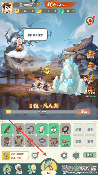 1、进入游戏,点击"铁镐"图标敲击矿山获取装备;