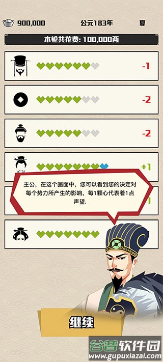 4、每回合需优先处理最紧急的势力事件,例如百姓请愿或将士索饷,不同选择影响后续事件链。