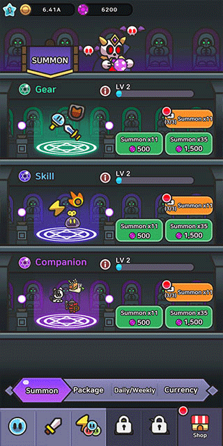 3、装备和技能通过抽卡获取,商店分为装备区、技能区和宠物区三个卡池