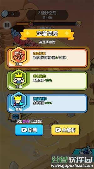 5、宝箱掉落时会出现三种强化选项,包含攻击强化、建筑修复、临时士兵等效果;