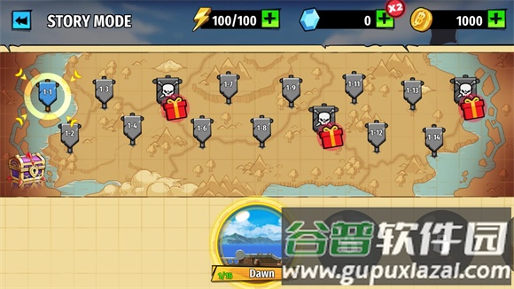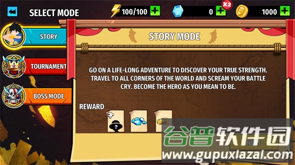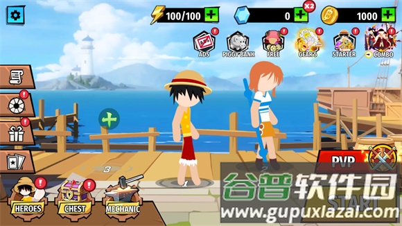 游戏主界面点击start按钮即可开始;模式选择界面包含闯关、竞技等多种玩法;选定关卡后进入战斗场景,左侧虚拟摇杆控制移动,右侧按键区包含攻击、防御和技能释放功能;击败敌方全部成员即可获胜,胜利后获得金币和道具奖励;主界面的heroes选项可查看角色库,使用资源解锁新角色或强化现有英雄。