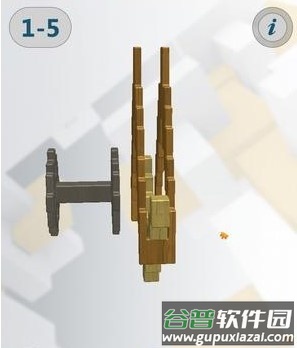 初始关卡包含三个基础部件,两个V型木条可上下滑动,中间螺帽状部件受限于两侧卡槽;先将上方深色木条推至顶端,使锯齿与螺帽纹路对齐;接着下拉浅色木条扩大操作空间;旋转视角至侧面,沿木条边缘平移取出螺帽;剩余部件采用相同原理即可完成拆解。