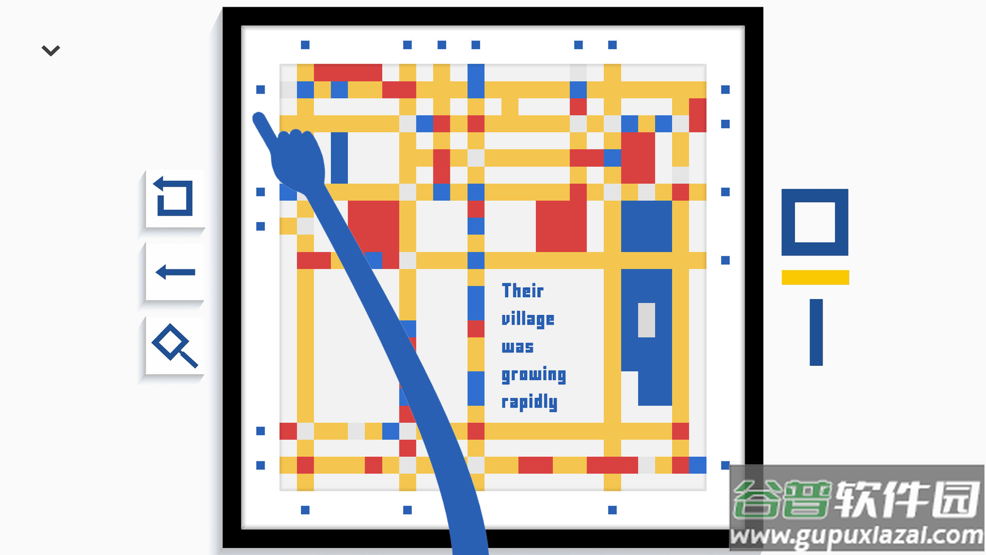 玩家需要帮助蓝色方块woogie穿越障碍物与红色方块boogie重逢,随着关卡推进,场景会从简单几何图形演变为复杂都市景观;在画布修复环节,通过点击特定区域还原蒙德里安风格的网格画作,每次触碰都会触发色彩扩散效果;第三章的字母收集玩法中,角色沿着建筑轮廓移动时,收集到的字母会实时拼接成俳句诗。