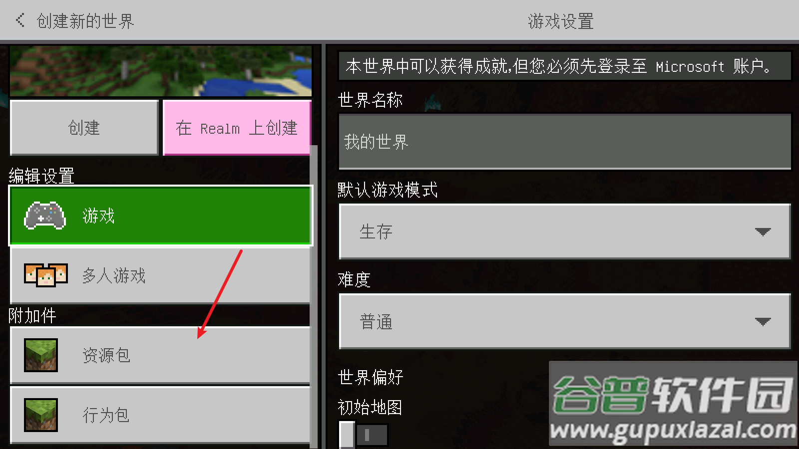 1、启动游戏后选择创建新世界,在设置界面左侧菜单定位到资源包选项;