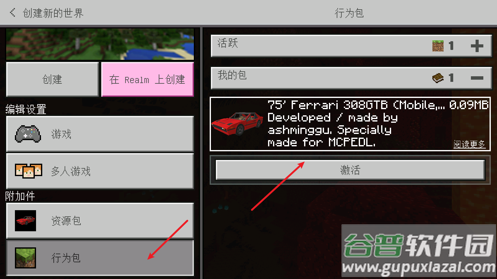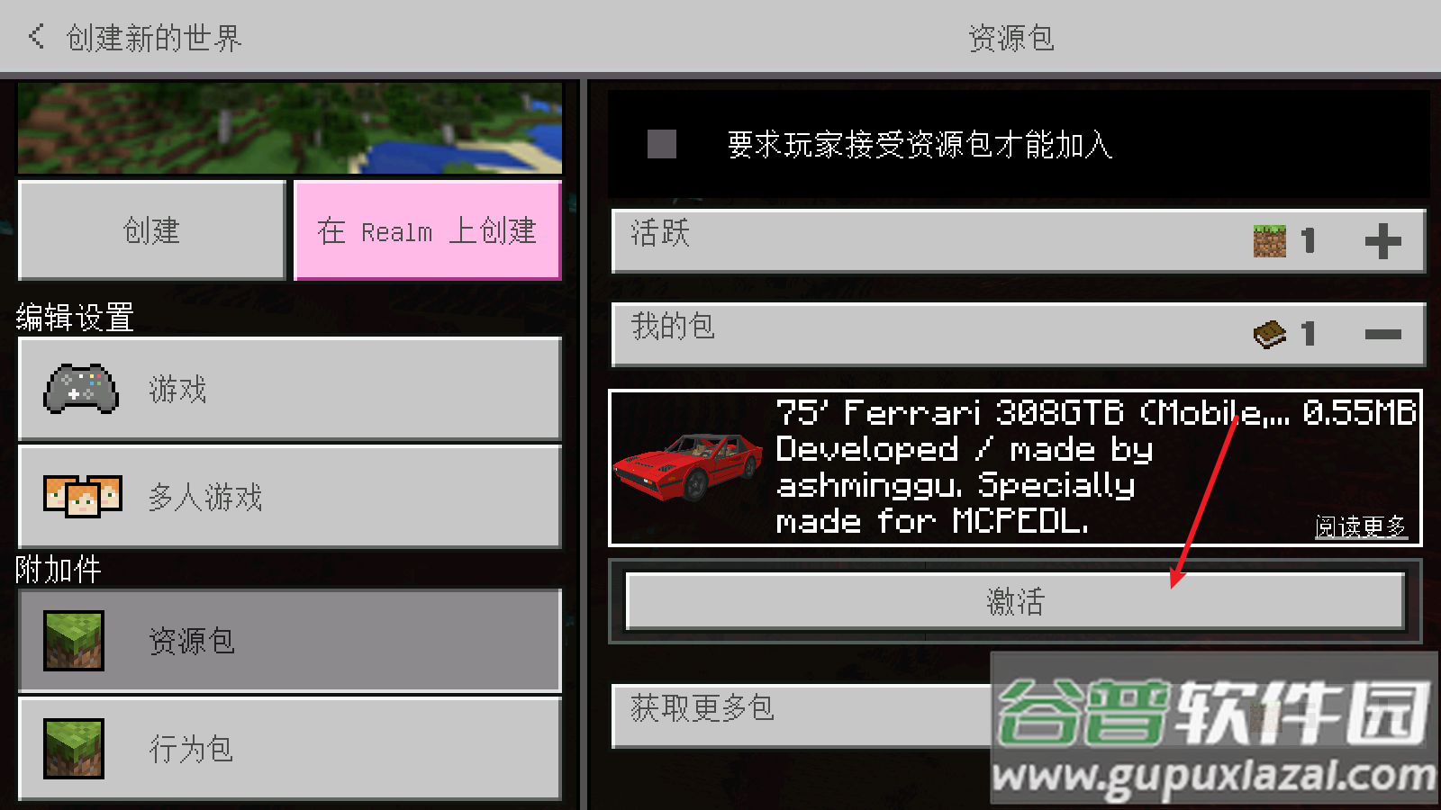 2、在资源包列表中找到已下载的跑车模组文件,点击右侧激活按钮完成加载;