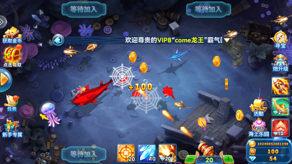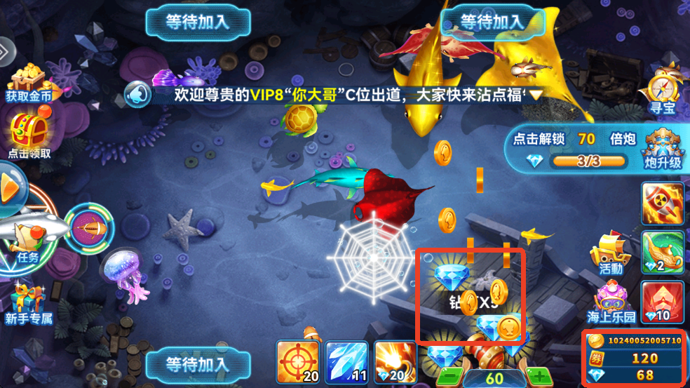 1、新玩家登录即送8888金币和高级捕鱼道具大礼包